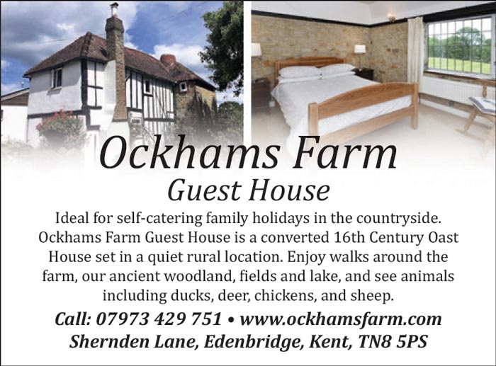 ADDRESS & CONTACT Address Shernden Lane, Edenbridge, Kent, TN8 5PS GPS 1, 1 Telephone 01732 862 173 Email bookings@ockhamsfarm.com Web https://www.ockhamsfarm.com Social Media Facebook Twitter / X Instagram Linkedin YouTube TikTok Pinterest IMAGE GALLERY OPENING TIMES