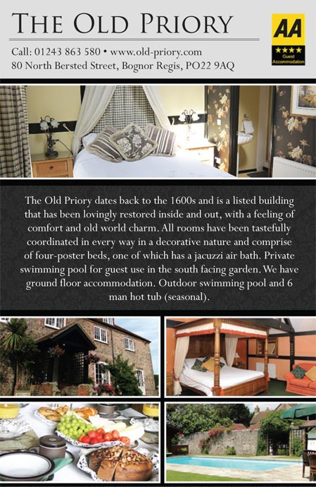 The Old Priory dates back to the 1600s and is a listed building that has been lovingly restored inside and out, with a feeling of comfort and old world charm. All rooms have been tastefully coordinated in every way in a decorative nature and comprise of four-poster beds, one of which has a jacuzzi air bath. Private swimming pool for guest use in the south facing garden. We have ground floor accommodation. Outdoor swimming pool and 6 man hot tub (seasonal). At the Old Priory B&B Bognor Regis we pride ourselves on our reviews, from positive too constructive we hope to hear from everyone that stays. You can find our B&B reviews on Trip Advisor, Google+, Facebook and many more.