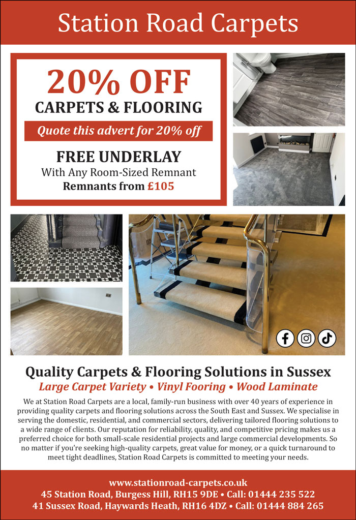 ADDRESS & CONTACT Address 45 Station Road, Burgess Hill, West Sussex, RH15 9DE Telephone 01444 235 522 Email burgesshill@stationroad-carpets.co.uk Web https://www.stationroad-carpets.co.uk Social Media Facebook Twitter / X Instagram Linkedin YouTube TikTok Pinterest IMAGE GALLERY OPENING TIMES